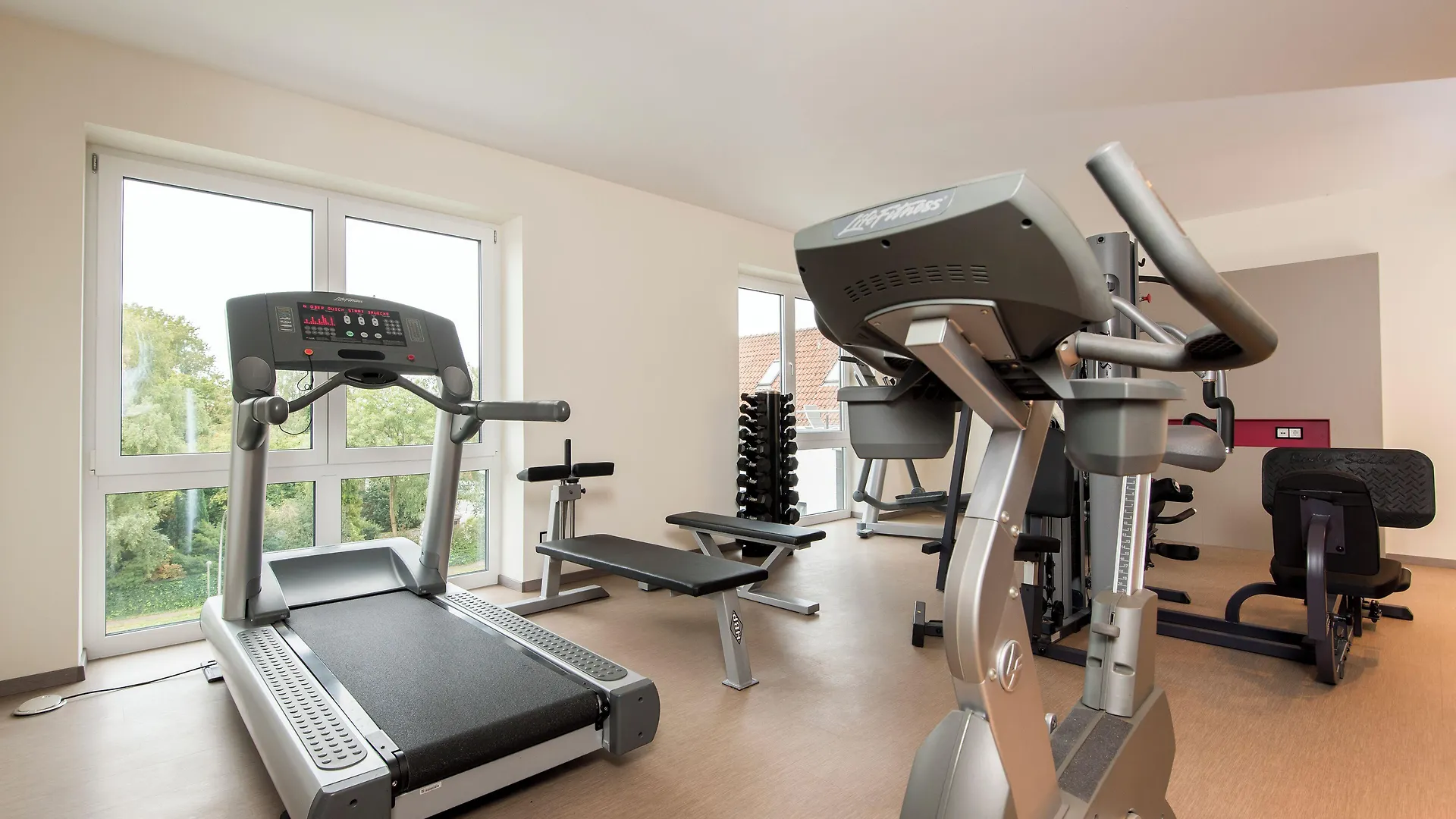 Es gibt einen Fitnessraum mit einem breiten Sportangebot.